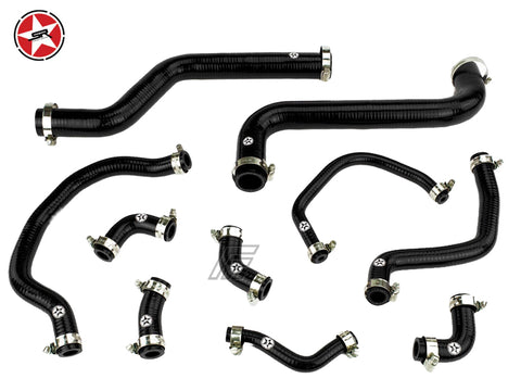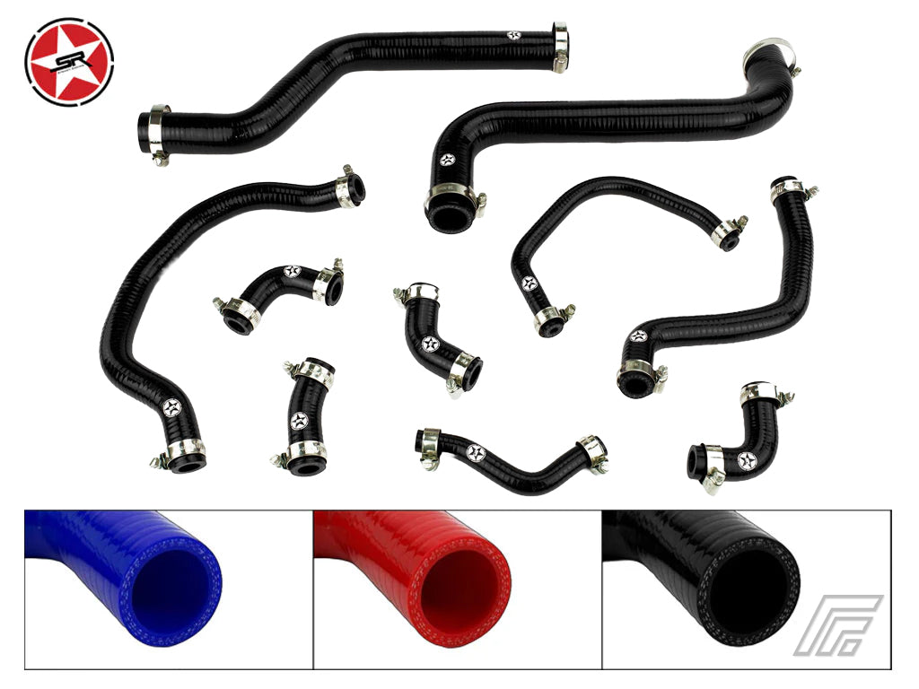 This high quality reinforced silicone hose kit replaces 10 coolant hoses in the engine bay listed below.
