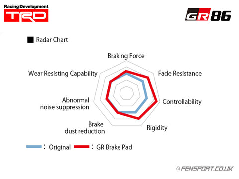 TRD GR brake pads have an emphasis on controllability, along increased fade resistance and rigidity for improved pedal feel.