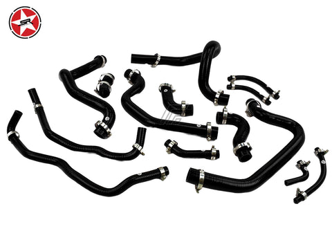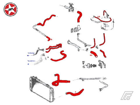 This high quality reinforced silicone hose kit replaces 14 coolant hoses in the engine bay and at the front of the car listed below.